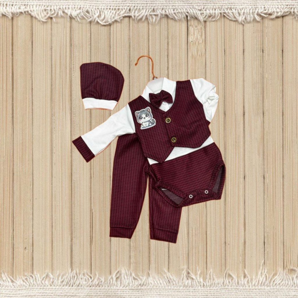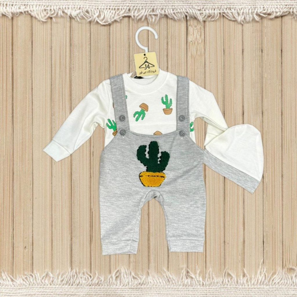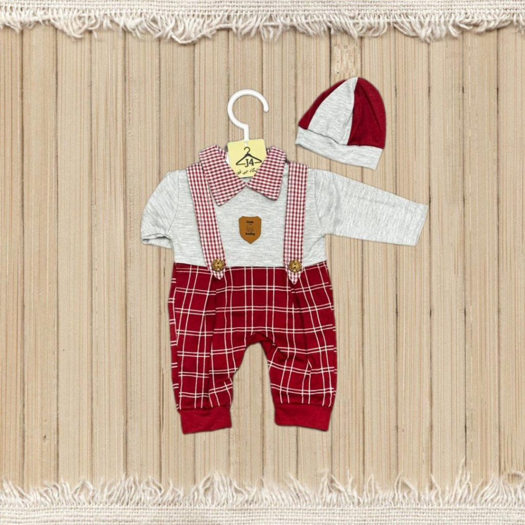ست سه‌تکه نوزادی پسرانه مدل کلاسیک (کلاه‌دار) این ست شیک و کلاسیک شامل یک لباس یکسره با طراحی بند دار