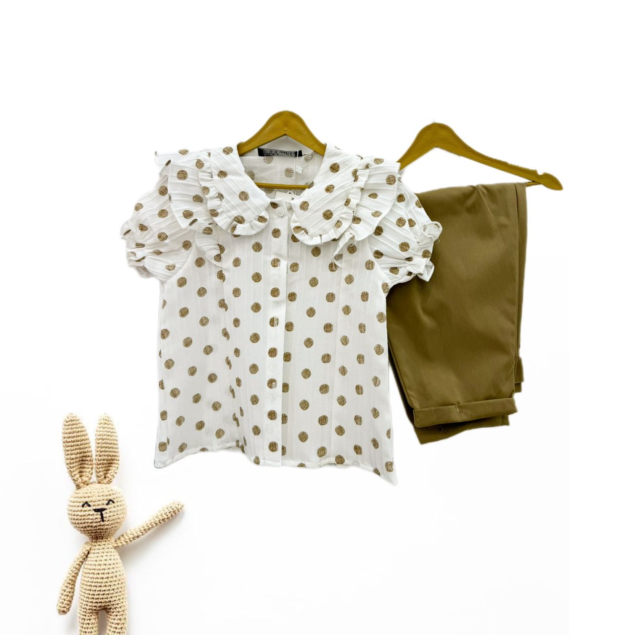 این ست دو تکه شامل بلوز سفید با طرح خالخالی زیتونی و شلوار ساده سبز زیتونیرنگ، یکی از بهترین انتخابها برای روزهای گرم ساله.