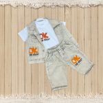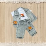 این ست شامل تیشرت سفید ساده با چاپ، جلیقه جین سبک، و شلوارک جین با طراحی اسپرت و چاپ جذاب روی پاچه است.