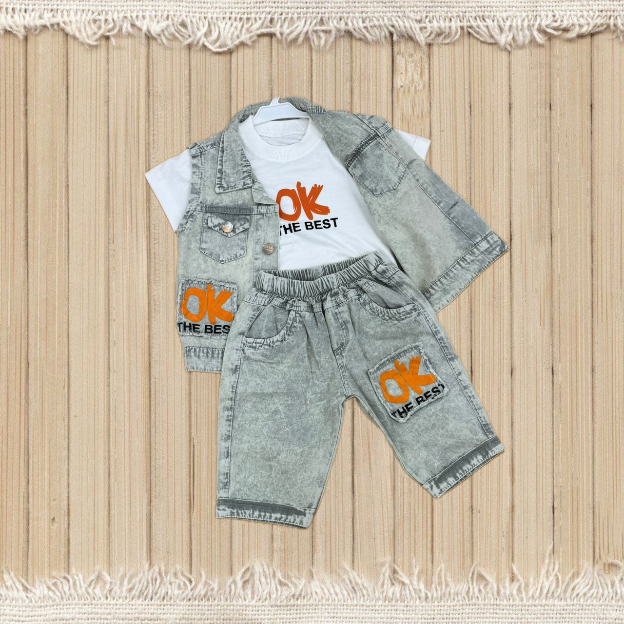 ست سهتکهی خاص با رنگ کرمی روشن و طرح چاپی OK THE BEST، انتخابی عالی برای استایل تابستانی کودک شماست.