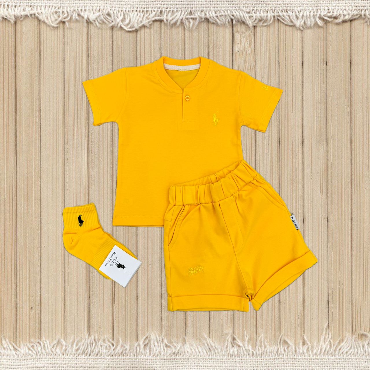 این ست شامل یک تیشرت یقه‌دار دکمه‌ای و شلوارک راحت با کمر کشی و دو جیب کاربردی است که از جنس نخ پنبه‌ای لطیف و باکیفیت دوخته شده است. جوراب طرح پولو نیز همراه این ست ارائه می‌شود.