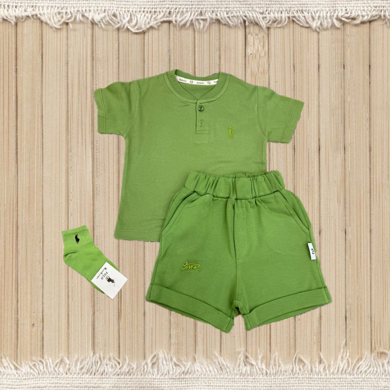 این ست شامل یک تیشرت یقه‌دار دکمه‌ای و شلوارک راحت با کمر کشی و دو جیب کاربردی است که از جنس نخ پنبه‌ای لطیف و باکیفیت دوخته شده است. جوراب طرح پولو نیز همراه این ست ارائه می‌شود.
