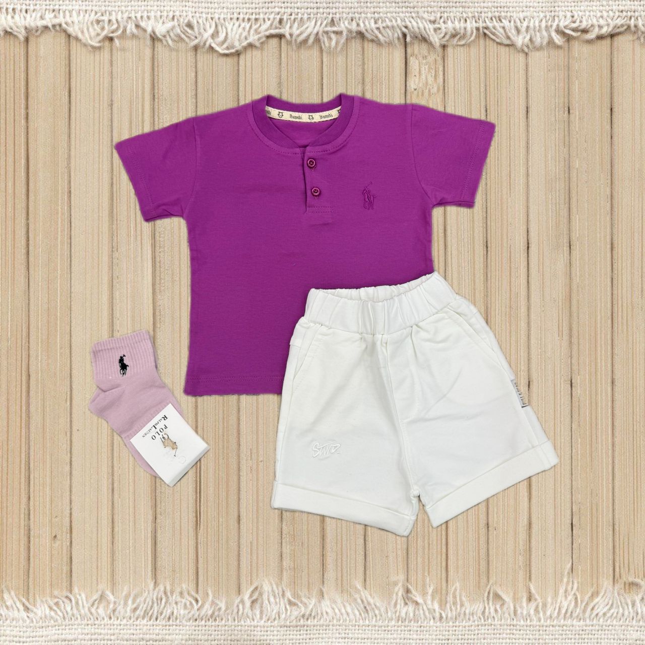 این ست شامل یک تیشرت یقهدار دکمهای و شلوارک راحت با کمر کشی و دو جیب کاربردی است که از جنس نخ پنبهای لطیف و باکیفیت دوخته شده است. جوراب طرح پولو نیز همراه این ست ارائه میشود.