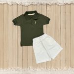 پولوشرت سبز تیره با یقه کلاسیک و دو دکمه، در کنار شورت سفید مینیمال با دوخت تمیز و کمر کشی راحت، ترکیبی ایدهآل برای استایلهای روزمره و رسمی کودکانه است.