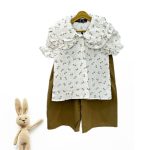 شلوارک کرمقهوهای با برش آزاد و جنس لطیف، به راحتی با بلوز ست شده و آزادی حرکت کودک را فراهم میکند. این ست برای استفاده در تولد، مهمانی، گردش روزانه یا حتی عکسهای بهیادماندنی کودک کاملاً مناسب است.